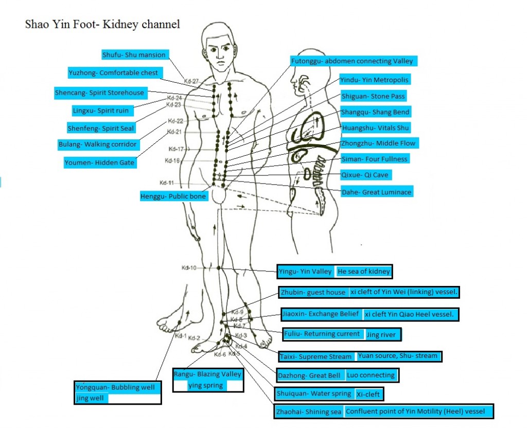 Shaoyin Kidney (KD): 1) Coccyx- internal runner anterior to spine. 2) Branch connects with UB and Uterus. 3) Branch from Kidney to Liver-through diaphragm to Lung- esophagus to throat and tongue root. Second branch from lungs to heart and chest meets up with Pericardium channel.