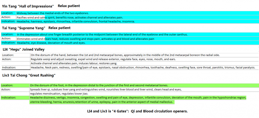 Hegu- Large Intestines 4, command point of face good for headaches. NOT for PREGNANT women!