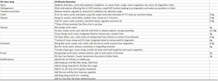 Chief herb: Qiang hou: warm, acrid, release wind cold, expel damp in upper body 4-5g