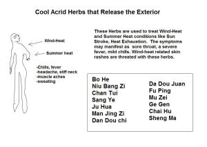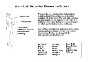 These herbs release wind-cold and external cold that invade superficial layers of the body. They disperse cold and restore the superficial layer. Wind-cold symptoms are headache, body aches, aversion to wind, fever and chills, cough with clear phlegm, nasal charge with clear phlegm. pale tongue, floating and tight pulse.