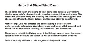 Du Huo “Angelicae Pubescentis Radix”Herbs that Clear Wind-Damp Warm Acrid, bitter Liv, Kid, UB Dispel Wind-damp, alleviates pain in lower body, Disperse Wind-cold-damp, exterior, Shao Yin Headache.