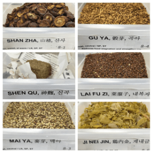 Mai Ya (barley sprout)Herbs that relieve food stagnation neutral sweet Liv, Sp, ST reduce food stagnation due to starches and fruits, soften areas of hardness, improve appetite 9-15g women who are nursing/lactation.