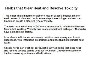 In TCM toxicity refers to infectious disease including febrile/viral: mups, measles, Infectious skin: Sores, mastitis, appendicitis, etc. They are cold and bitter herbs that treat febrile diseases and clear toxicity from skin and body.