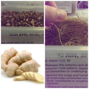 Gu Zhi- Cinnamomi Ramulus (Cinnamon twig)- warms the blood. Release exterior, assists yang, warms and unblocks channels, Bi syndromes of wind-cold-damp, assists heart yang, warm to the capillaries.