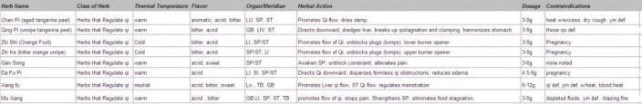 Mei Gui Hua Herbs that Regulate qi Warm Sweet, slight bitter Liv., SP Gently regulates Qi and Blood, harmonizes Liv, SP, ST. Regulates menstruation. 1.5-6g none