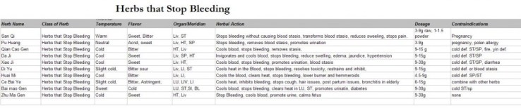Bai Ji Herbs that Stop Bleeding Cool Bitter, sweet LU, ST, Liv. Restrains to stop bleeding, reduces swelling, generates flesh 3-15g excess heat and fire, pre-existing lung issues,coughing blood