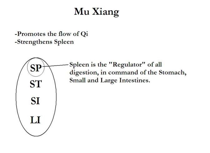 Mu Xiang warm acrid , bitter GB,LI, SP, ST, TB promotes flow of qi, stops pain, Strengthens SP, eliminates food stagnation, 3-9g contra: depleted fluids, yin def., blazing fire.
