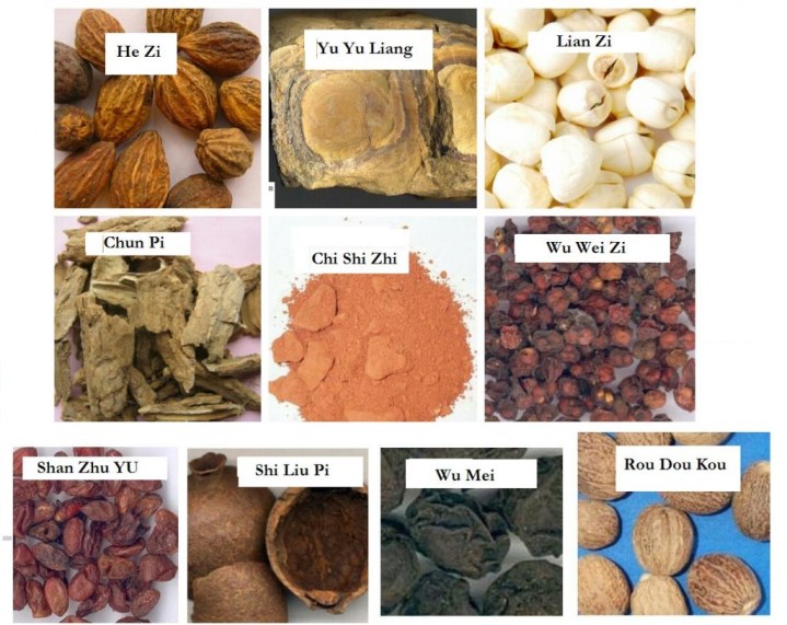 3) Stop Lower body leakage spermatorrhea, Leukorrhea, Urinary Frequency: Wu Wei Zi, Lian Zi, QianShi, Shan Zhu Yu, Jin Ying Zi, Sang Piao Xiao, Fu Pen Zi, Hai Piao, Xiao.