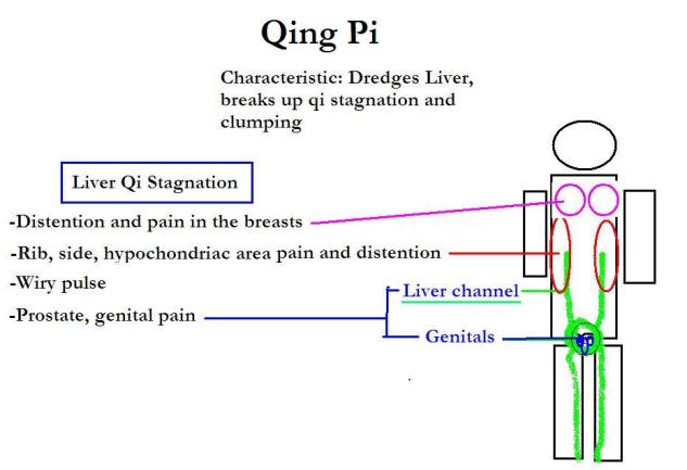 Qing Pi (unripe tangerine peel) warm bitter, acrid GB, LIV, ST Directs downward, dredges liver, breaks up qi stagnation and clumping, harmonizes stomach. 3-9g contra: those qi def.