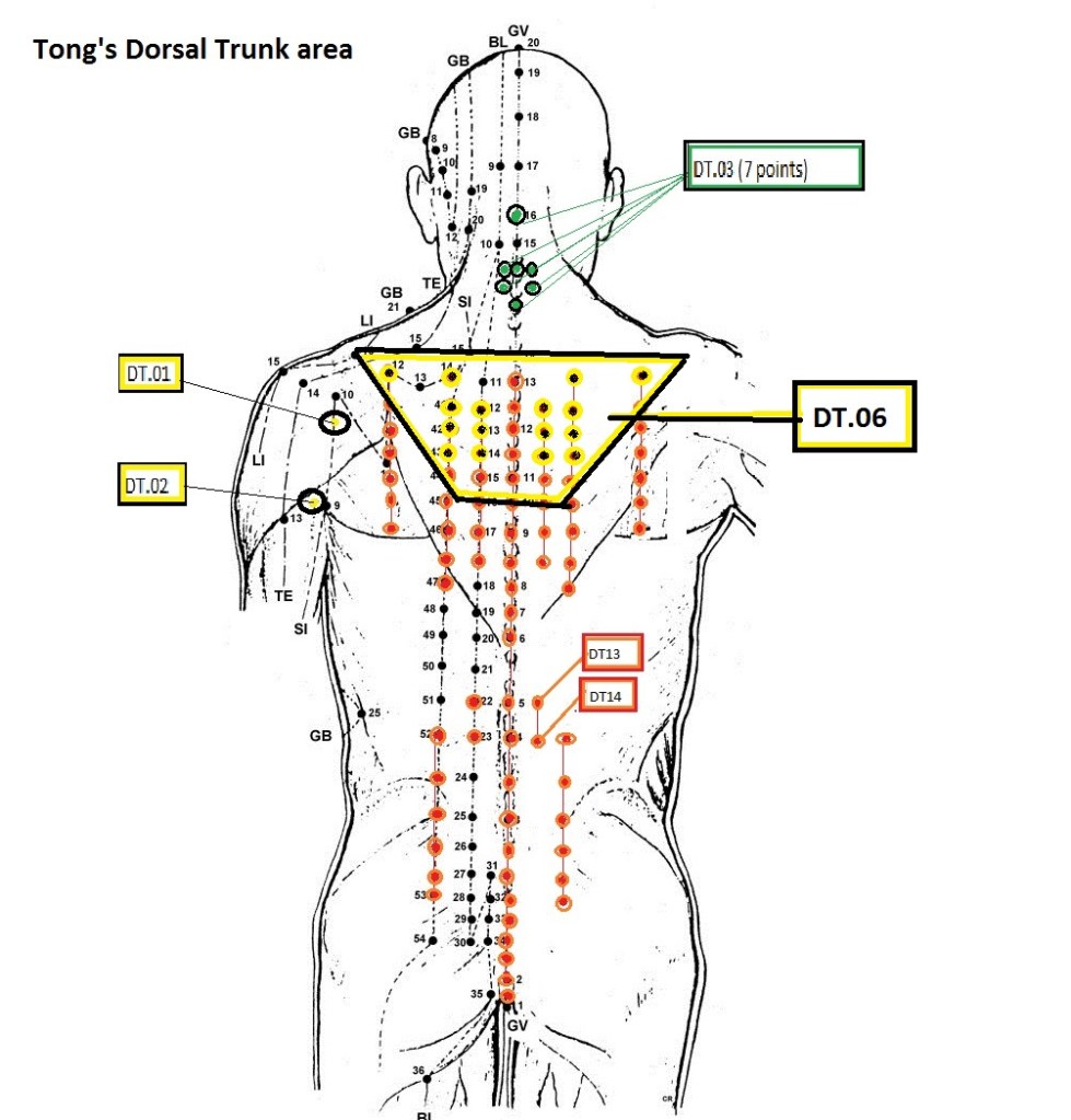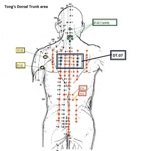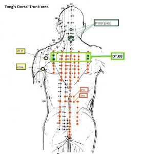 DT.05 (7 points) Shuang Feng / Ssang Bong (Phoenix pair) Location: 1.5 Cun lateral to the posterior midline, T2 to T8, levles with the lower border of the spinal process of each vertebrae.