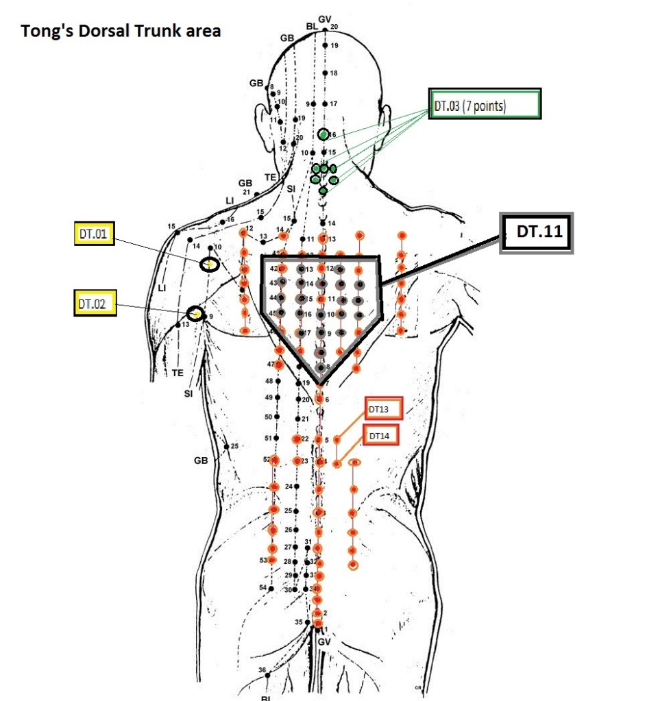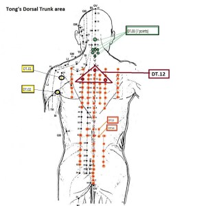 DT.04 Wu Ling / Oh Ryung (five mountain ranges) Location: 1st line (10 points): On the posterior midline, from T2 to T11, lower bordeers of spinal process of each vertebrae.