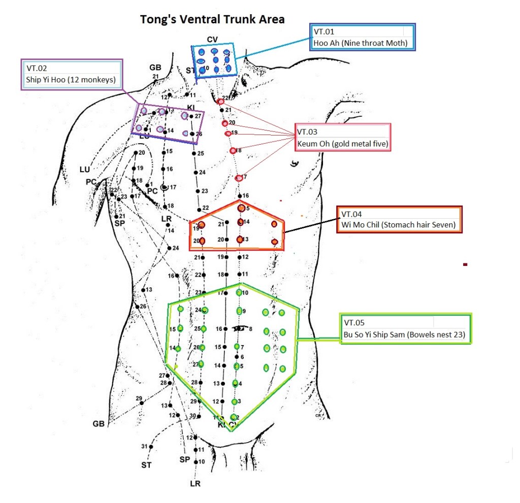 VT.02 Shi Er Hou / Ship Yi Hoo (12 monkeys) Location: On the 1.3 cun and 2.8 cun parallel line to and below the clavical, at the end and mid of each line.