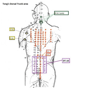 DT15 San Jiang / Sam kang (three large rivers) Location: 1st line (7 points): On the posterior midline from L1 to S2, lower borders of spinal process of each vertebrae, Boon Sun, Soo boon, Soo Keuk, Soo Kwan, Yuk Jong, Bong So, Joo So.