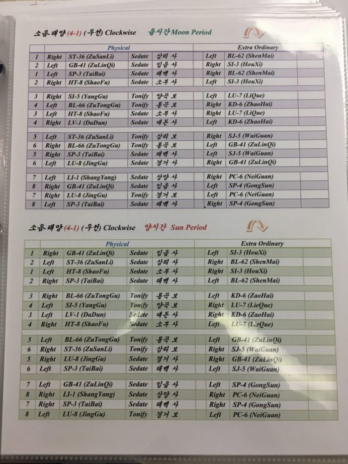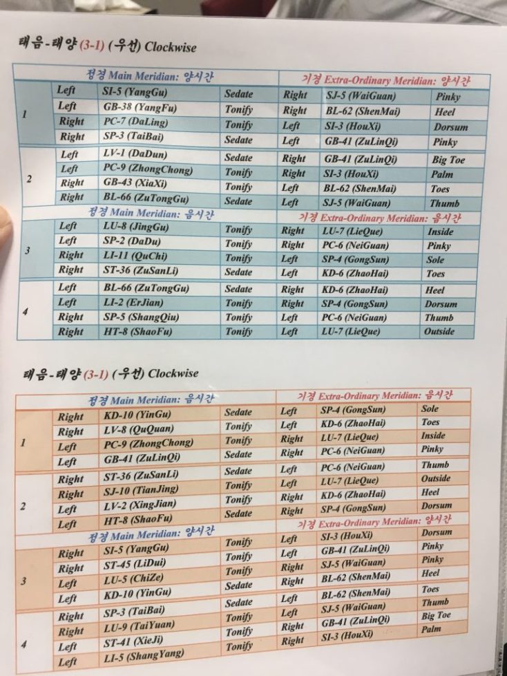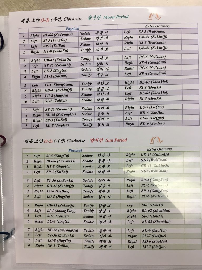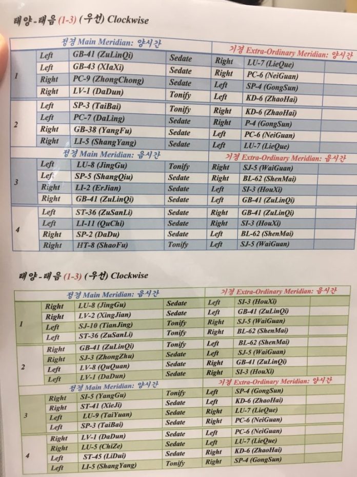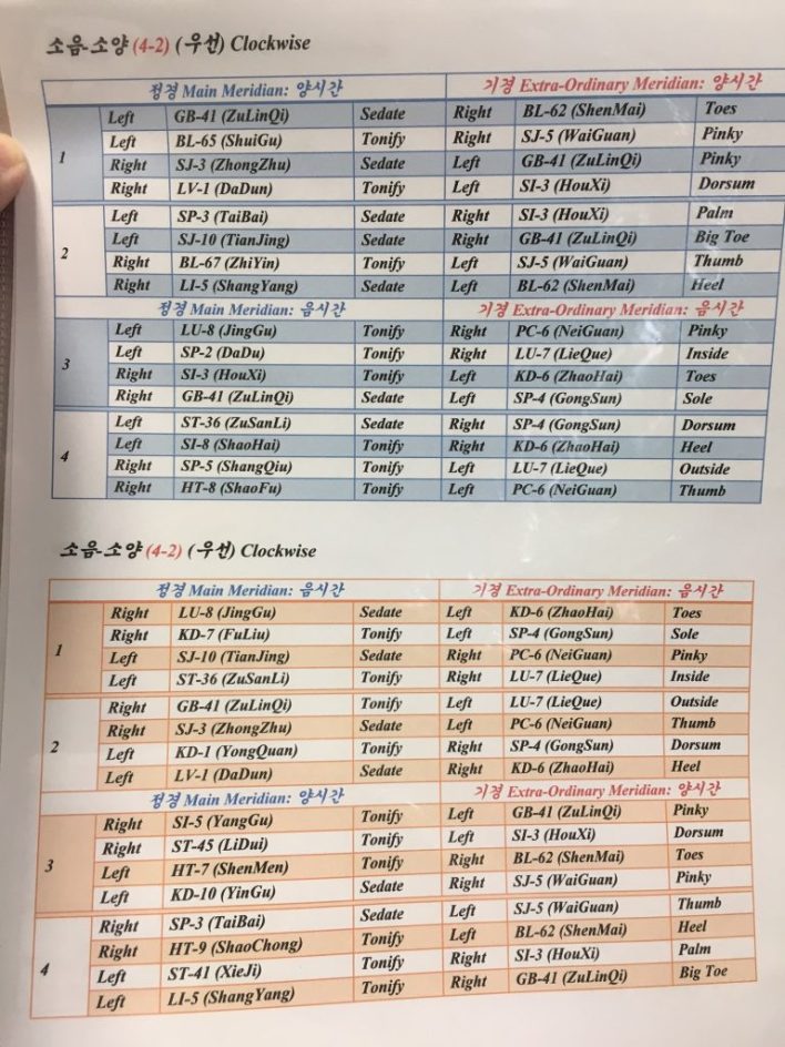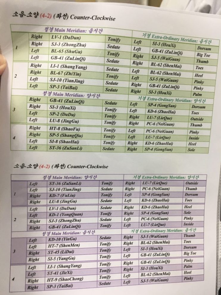 In the future a book will be translated/written by my intern teacher Dr. Pyo, but his brother who is a Western medical doctor, qigong master, and acupuncturist devised this method based on the 5 element “shu points” and extraordinary points using theory of polarity, the universe, nature, and earth.