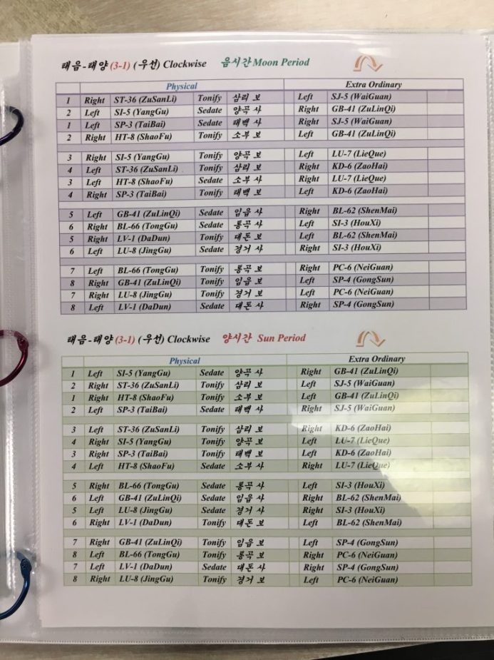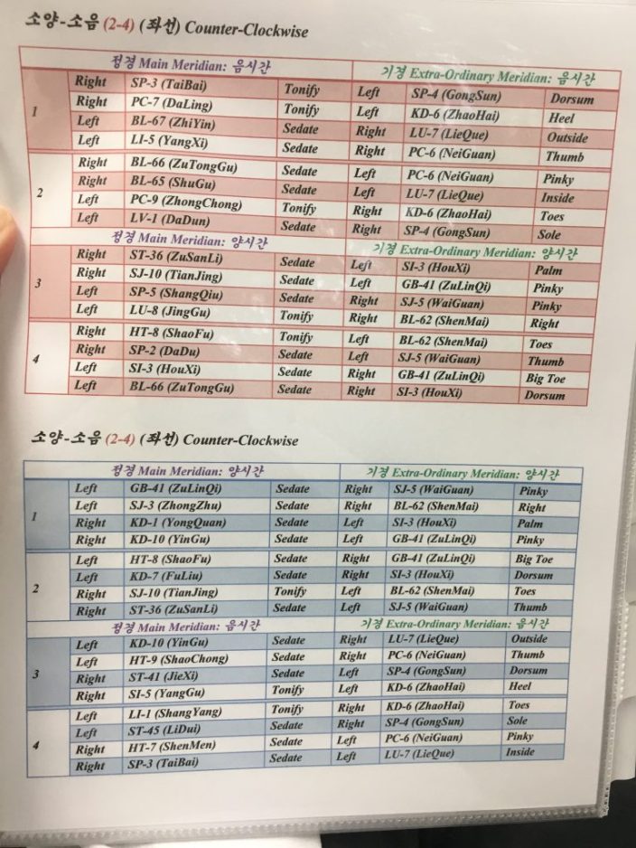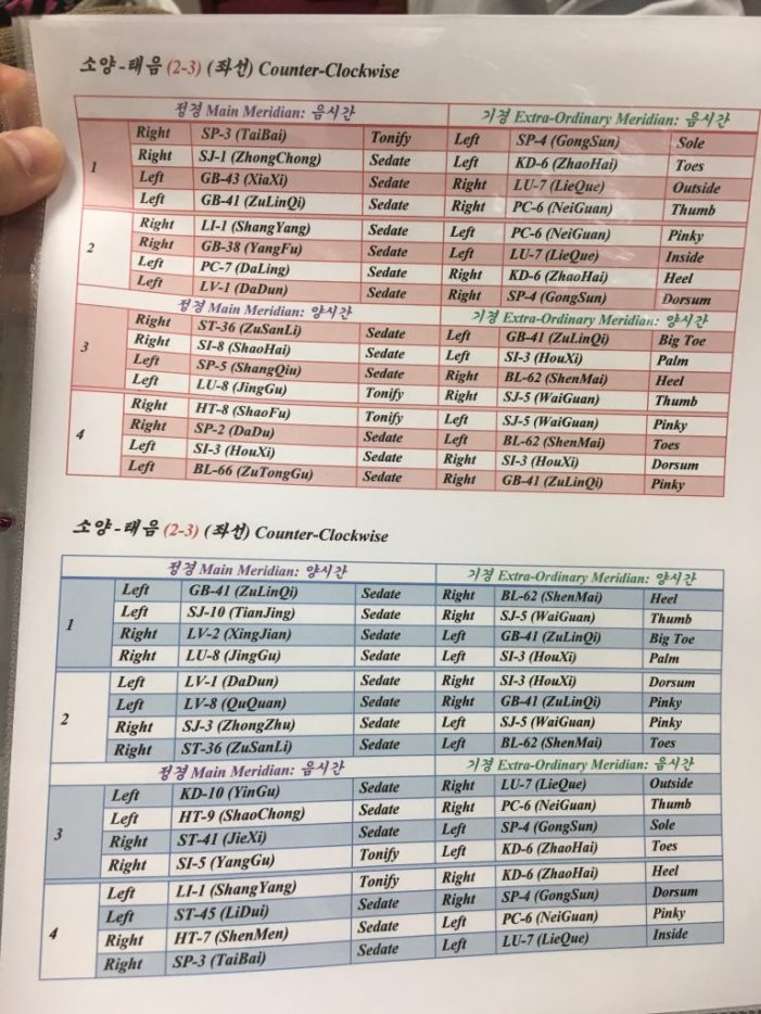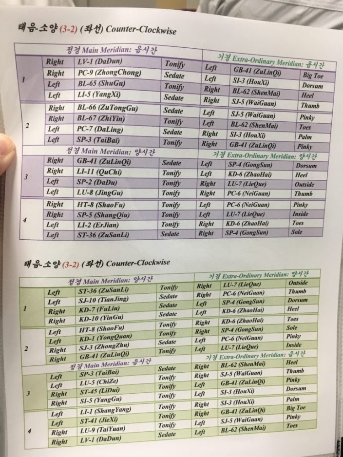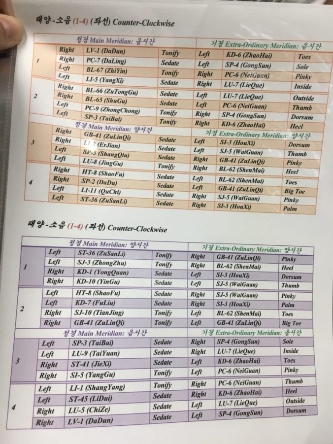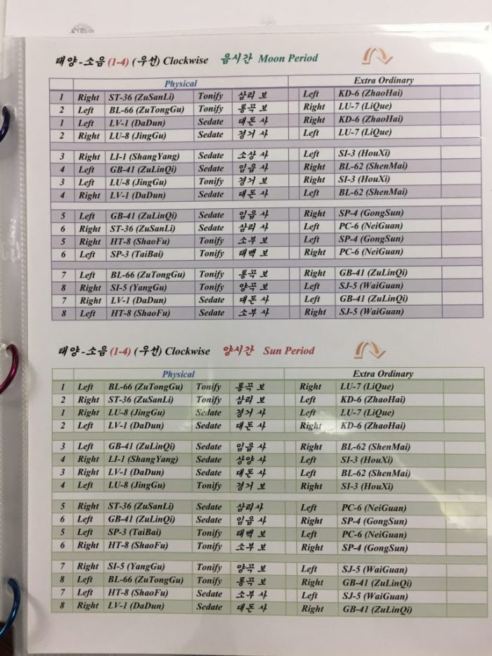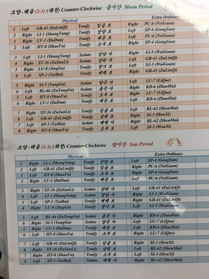 In the future a book will be translated/written by my intern teacher Dr. Pyo, but his brother who is a Western medical doctor, qigong master, and acupuncturist devised this method based on the 5 element “shu points” and extraordinary points using theory of polarity, the universe, nature, and earth.