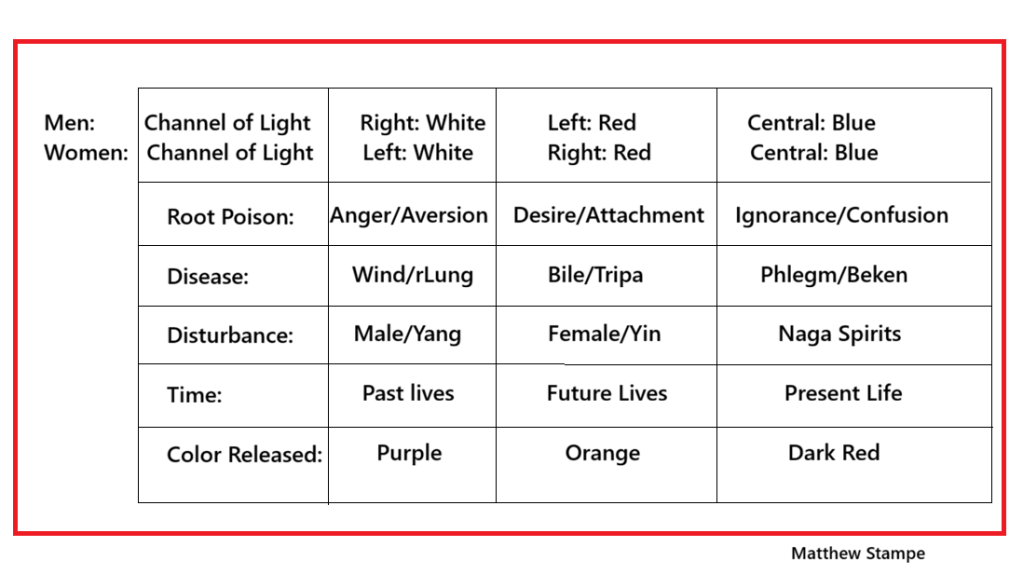 Awakening the Sacred body: he narrows down some of the physical Tibetan Yogas into two primary methods for beginners to experience the body, energies, and mindfulness. The 9 breathings of purification, a method we always began practice sessions with were re-emphasized. The 9 breathings are basically the pranayama “alternate nostril breathing” taught in many yoga schools worldwide. His pranayama version is specific to his Tibetan tradition, not quite the same as Hatha yoga. 9 breathings balances the humors of the body of wind (Loong/rLung in Tibetan) , bile (Tripa in Tibetan), and phlegm (Bedken in Tibetan) seen in Ayurvedic medicine’s Vata (Wind-type ), Pitta (Bile-type), and Kapha (Phlegm-type) mind-body-energy type of Dosha classifications.