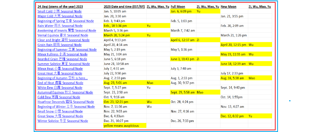 The jieqi are 24 transitions through the constellations so it is a practice of the “stars” while moon we use full and new moon. For the sun, it is daily practice in the Zi, Wu, Mao Yu times. Zi is 11pm to 1am, Wu is 11am to 1pm, mao is 5-7am, and Yu, is 5-7pm (basically midnight, midday, sunrise, sunset). Very powerful meditation times in many cultures. If a full or new moon or jieqi time is within the zi, wu, mao yu time it is auspicious. Keep in mind the jieqi times can be dangerous- accidents can happen, terminally ill people may die. People tend to have a real bad day if they are unaware. High blood pressure and headaches are common. 12 of the jieqi times are based on the 12 zodiac changes through the year, while the other 12 are half-way between the zodiac change times. total 24.