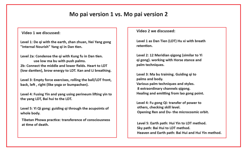 *Mo Pai is a hidden school and meant to be a hidden school with a strong view of yuanfen. That is, your life path will either bring you to a Mo pai master or it will not. Kostas Danaos and Jim McMillian are two who we can verify became students of John Chang. Others I cannot confirm. The training can be dangerous without guidance of a master like John Chang. It was originally a killing art, not a healing art. It has focus on some deadly palm striking, built off of years of neigong training to develop a powerful internal force.