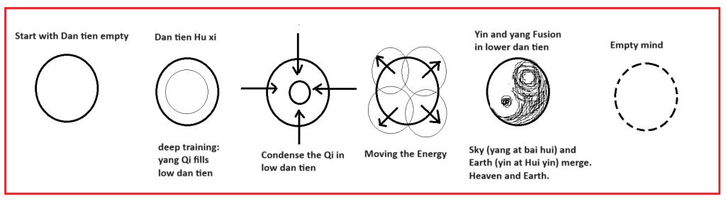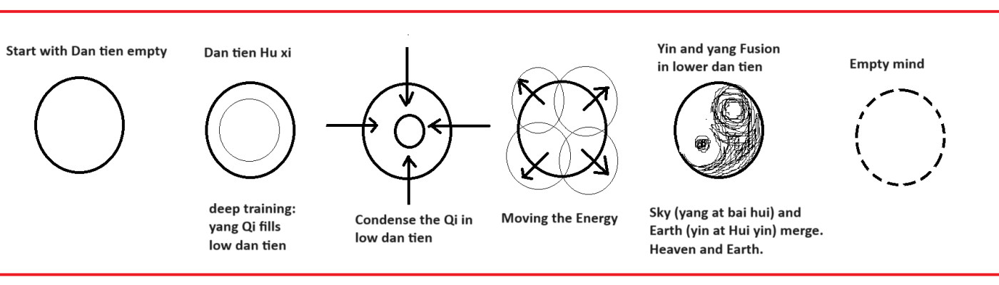 Stuart Olsen wrote about Chang San Feng and says, Chang San Feng liked to practice the sword in the moonlight to enliven his shen, Tai Chi in the dark to increase his jing, climb mountains to broaden his Qi, read and study to illuminate his mind, and to practice sitting neigong at the Zi time (midnight) to develop clarity to one’s true nature. It is also mentioned that xing gong, ming gong, and medicine, were the way to attain the Tao. Xing gong helped to awaken the spiritual nature, Ming gong nourished your life, and medicine harmonized the yin and yang of a person. Other parts of Stuart’s books said that Chang San feng’s basic idea was there is a difference between “Attaining” and “Realizing” the Tao. “Attained in Tao” meant the cultivator has found the correct path to Tao through virtues and merit practices. “Realizing Tao” however was the ability to transform into the immortal body with practices of merit and virtue. Some more notes from Stuart Olsen’s book has a prescription that Chang San Feng gave: try 15 minutes of sitting, 15 minutes of standing (zhan zhuang), repeat 15 minutes of sitting, 15 minutes of standing, then15 minutes of standing then finally walking. Long forceful meditations were not required, and to make any progress, you need to devote the first 18 days to dan tien training and getting rid of the extra thoughts in the mind just to prepare ‘the cauldron’ at lower dan tien (LDT). The next 100 days are devoted to jing and qi in the lower dan tien to form the pearl. Lastly, 9 additional months working on the Xiao Chou tien or “microcosmic orbit”.