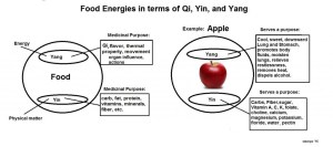 The Chinese have studied foods and the recognized the energy nature of each of them. The chi of the food is considered more important than any analysis of calorie or vitamin content. The Chinese doctor stresses that the patient is responsible for his or her actions and health. Once you have been taught the basics, you will know whether you are eating the wrong thing. This is a most basic, day to day activity that teaches you to nourish your chi, not just dump empty calories to satisfy cravings. The daily introspection on your dietary habits reveals the state of your energy. This study is based on principles that are fundamentally Taoist: eliminate extremes and return to the center.
