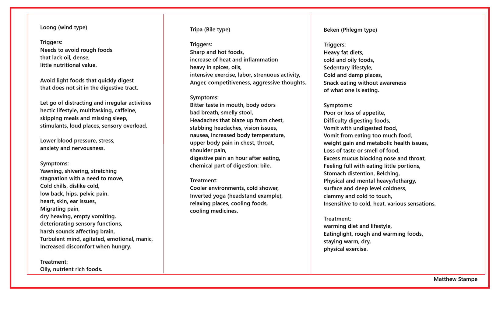 Another Way of looking at person and food choices is based on the 3 Humors of Wind, Bile, and Phlegm. People tend to be one major Humor with characteristics of a second one.