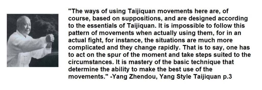 Tui Shou (Push/Sensing Hands), Da Lu (Big rollback), Da Shou (striking Hands) and San Shou (Free fighting).*