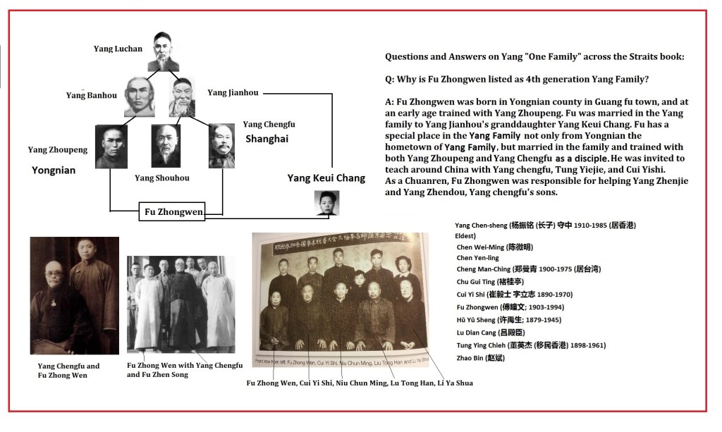 In 1944 Fu Zhongwen founded the Yongnian Taijiquan association in Shanghai with teachers like Cui Yishi, and Zhao Bin who opened Yongnian associations in other cities. Fu Zhongwen along with Cui Yushi also taught Yang Chengfu’s sons Yang Zhenjie and Yang Zhenduo who were very young at Yang Chengfu’s death.
