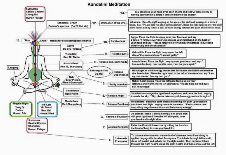 The second is gently through Sahaja mahayoga. It is a very nice method to use and very similar to qigong and neigong in some ways. This method is open and to the public. the main premise is that we all have the kundalini inside of us and you cannot charge money for what is already inside of you. First they raise the kundalini, second they do a bhanda to clear energy. Then they work on the chakra or wheels of energy along the centerline of body. There is a mantra “Hum Shum” which helps balance the hemispheres of the brain and helps with depression. It is repeated silently. They also will do silent sitting for about 15 minutes after activating the kundalini. There are also paired person methods to do like reiki style massage. On yourself and on a partner you can hover the the hand over the chakras and sense the energy there if weak or overly strong.