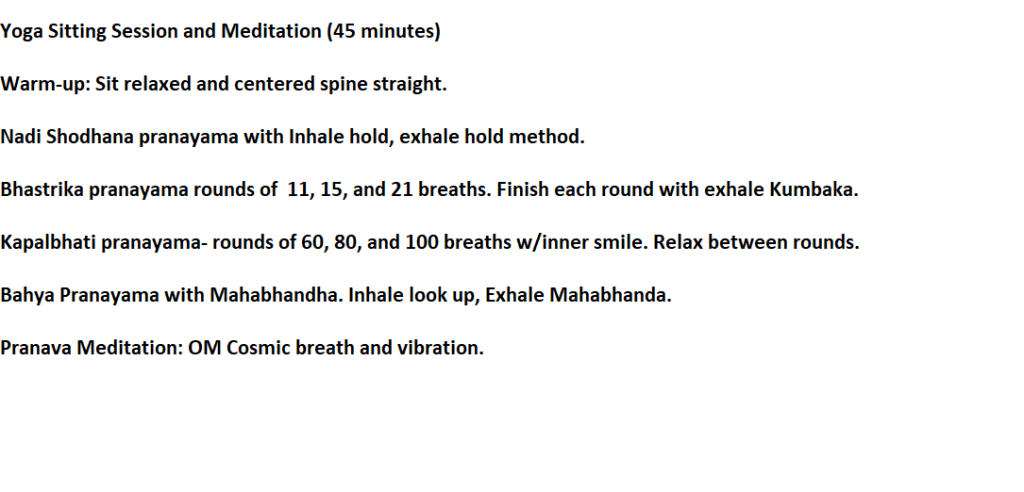 - Kapalbhati: stronger than Bhastrika using “breath of fire” fast inhale and exhales usually 30 to 100x a round. About 3 rounds.